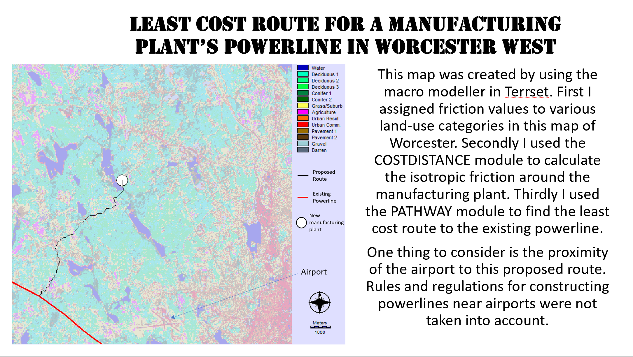 The airport is in the South portion of the Worcester West map. For safety reasons the airport may not allow a power-line to be built within a specified radius of the airport. This makes it so that the airport is a physical and legal barrier to this construction project. I would create a buffer region around the airport and in the cost-distance model assign this area a friction value of 1000.